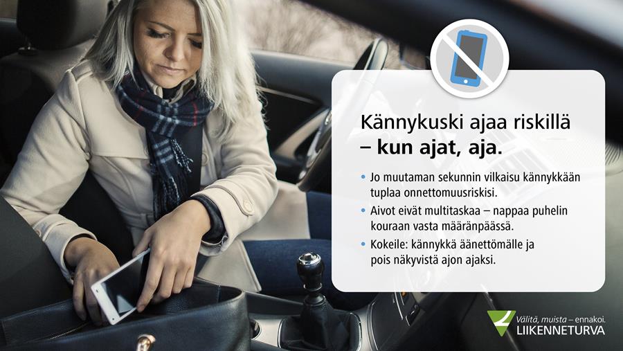 ”Liikennetilanteet voivat muuttua nopeasti ja tielle tulla yllätyksiä. Jos katse on kännykässä ja mieli poissa liikenteestä, ei näihin tilanteisin ennätä reagoimaan ajoissa tai tarvittavat korjausliikkeet tehdään väärään suuntaan ja myöhässä. Kännykkään keskittyvä kuljettaja voi myös itse toimia arvaamattomasti, mikä vaatii toisilta tienkäyttäjiltä reagointia, jotta onnettomuudelta vältytään”, kuvailee Liikenneturvan suunnittelija Petri Jääskeläinen.