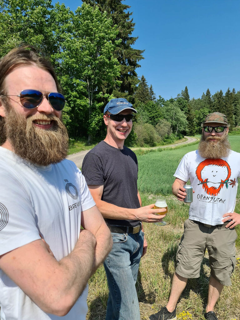 Viljelijä Jarno Siitonen sai oman pellon maltaasta tehdyn Järvi Pilsin käteensä. Vasemmalla humalat kerännyt Jussi Wallendahr ja oikealla oluen valmistaneen United Gypsies Breweryn Ilkka Miettinen.