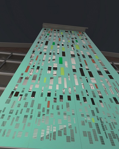 Teos koostuu mm. alumiinista, teräksestä ja värillisistä laseista. Se tuo väriä ja ilmettä kerrostalon portaikkoon sekä valoisaan että pimeään aikaan.