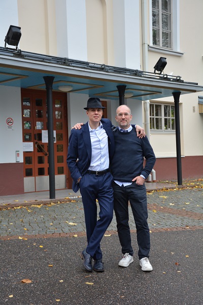 Pekka Puolakka (vas) ja Tuomas Törmi Harjulan edessä. The Great Mr Laugh -mykkäelokuva nähdään live-esityksenä Harjulassa 20.11. Aikoinaan mykkäelokuvien musiikit soitettiin aina livenä, koska ääntä ei vielä pysytty liittämään mukaan elokuvaan.