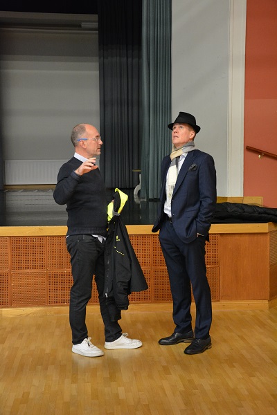 Tuomas Törmi ja Pekka Puolakka suunnittelemassa Harjulan esitystä.