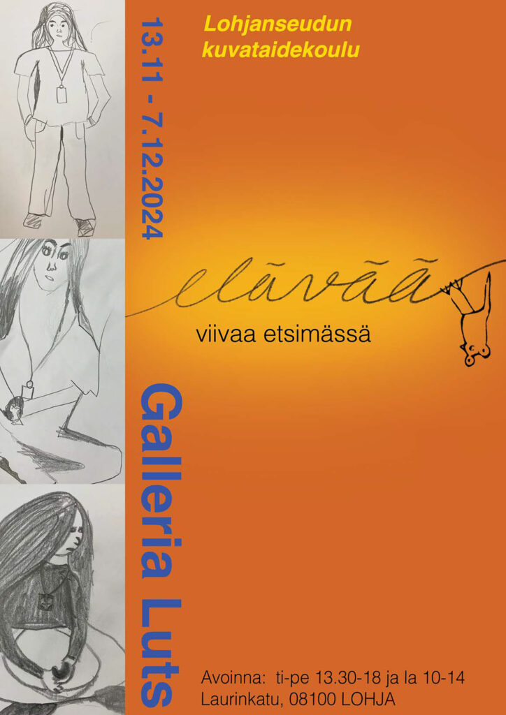 Lohjanseudun kuvataidekoulu lähtee liikkeelle etsimään elävää viivaa marraskuussa. Kuvataidekoulu työskentelee Laurentius-koulun Taidesiivessä sijaitsevien tilojemme lisäksi Lohjan keskustassa Galleria Lutsissa (Laurinkatu 48).