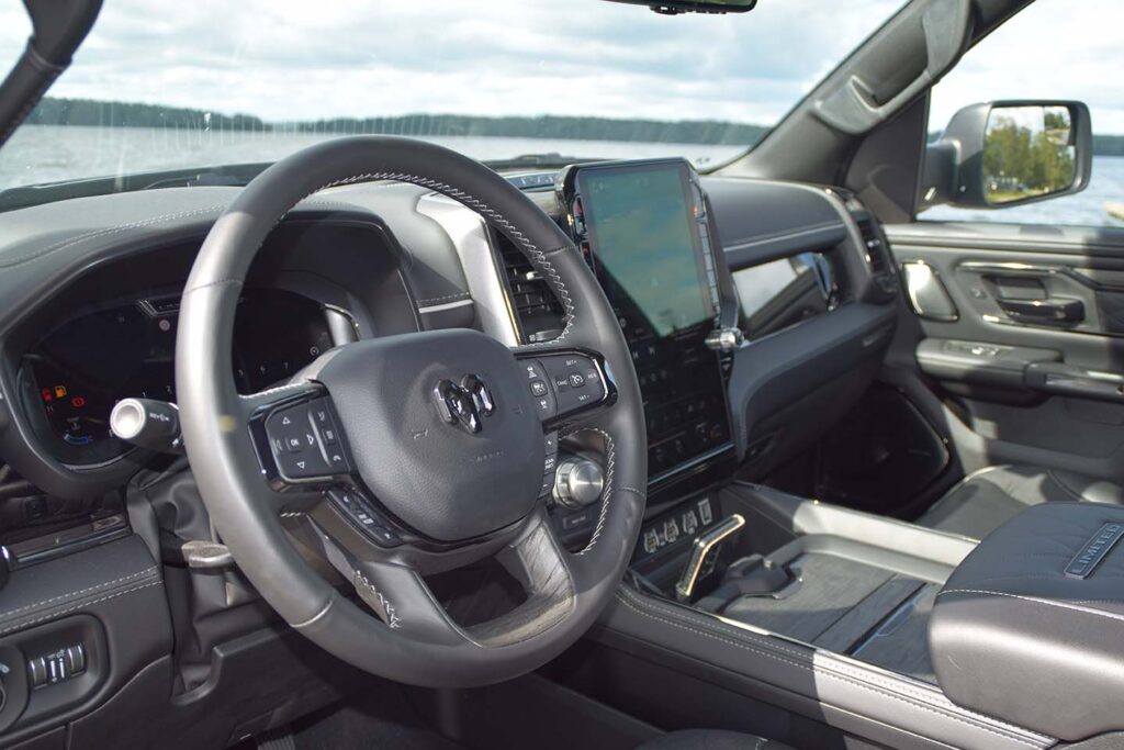 Sisätiloissa RAM 1500 on entistäkin modernimpi ja teknologisesti edistyksellisempi. Uusi Uconnect 5 -viihdejärjestelmä on vakiona kaikissa malleissa, tarjoten suuren, jopa 14,5-tuumaisen kosketusnäytön, joka on integroitu keskikonsoliin. Tämä järjestelmä on entistäkin nopeampi ja intuitiivisempi käyttää. Se tukee langatonta Apple CarPlaytä ja Android Autoa, mikä tekee älypuhelimen käytöstä entistäkin helpompaa. Lisäksi, järjestelmässä on mahdollisuus luoda useita käyttäjäprofiileja, mikä mahdollistaa henkilökohtaisten asetusten tallentamisen.