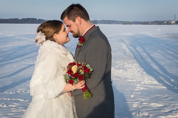 -Valkoinen maa ja valkoiset puut ovat todella harmonisia. Kesä on ihana, mutta olen enemmän talvi-ihminen. Oli todella tunnelmallistakin, kun meillä oli juhlapaikalla tuikkuja pilttipurkeissa ja kelluvia kynttilöitä isommissa lasipurkeissa, Enna Kuoreinen kertoo.