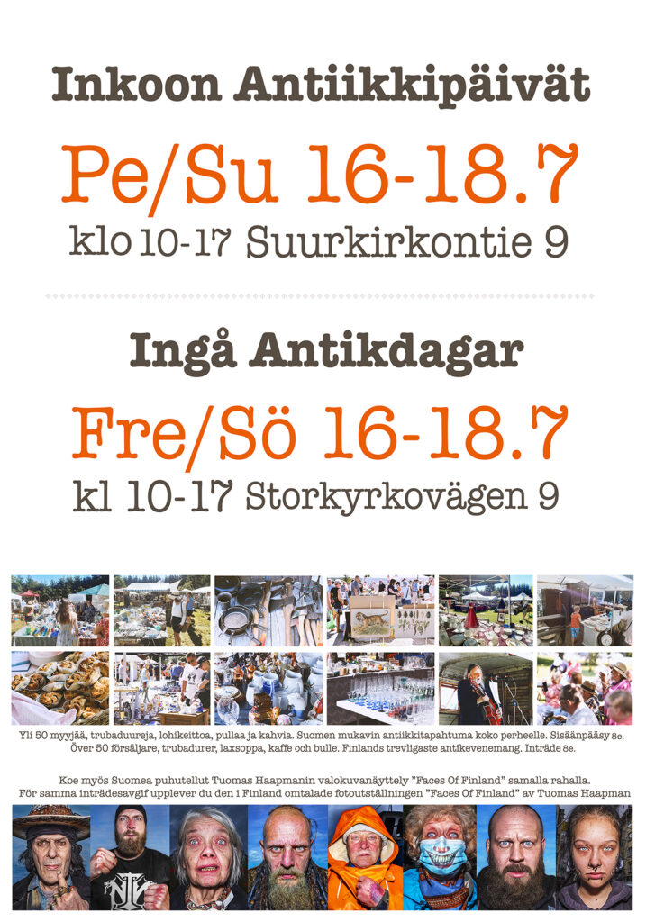 Jo perinteeksi muodostunut Inkoon Antiikkipäivät ovat pian taas täällä. Tapahtuma järjestetäänkin nyt jo viidettä kertaa ja sitä voikin kutsua suomen mukavimmaksi koko perheen antiikkitapahtumaksi. Tänä vuonna tapahtuma kasvaa kolmepäiväiseksi ja Inkoon suurimmaksi.