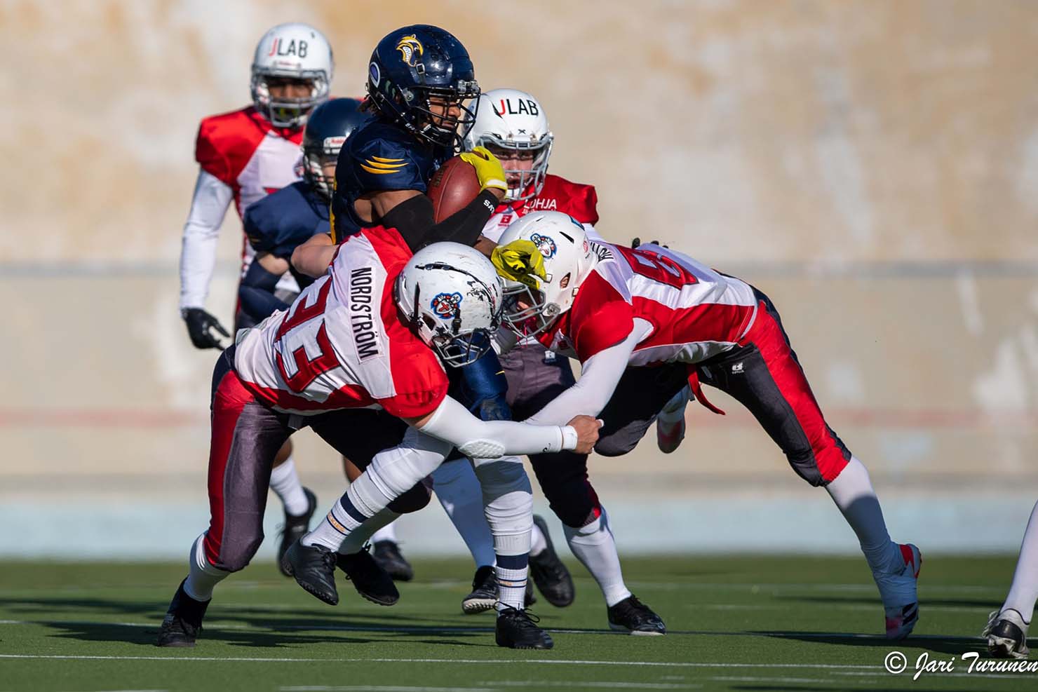 Jenkkifutis on raju laji. Lohjalaisen UNC:n punavalkopaidat ovat laittamassa helsinkiläisen Wolverinesin pelaajaa sämpylän väliin. (Kuva: Jari Turunen)