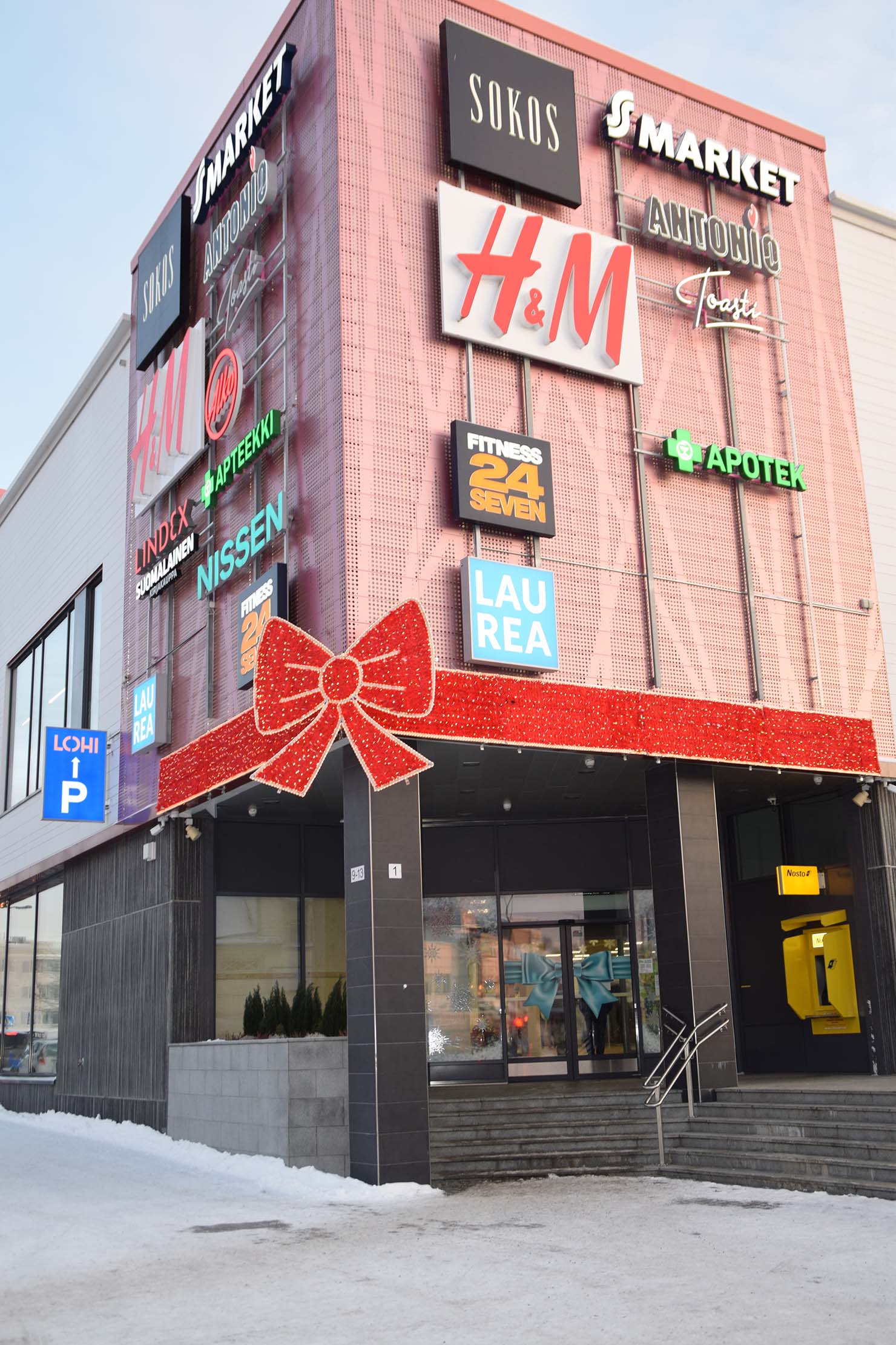 Kauempaa katsottuna hoksaa, että koko kauppakeskus Lohi on kietaistu yhdeksi paketiksi, joka on solmittu rusetilla. Suuret kaupat suhtautuvat jouluikkunoihin vaihtelevasti. Säästötalo Latvalalla on monipuolinen hahmokavalkadi, mutta esimerkiksi Prisman ulkopuolella joulu näkyy lähinnä tutuiksi tulleiden kausivalojen tavoin tuoden omalla tavallaan valoa joulunajan iltapäiviin ja iltoihin.