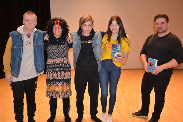 Waltteri Hokkanen (vas), Robin Östermark, Julius Heiskanen ja Eleora Turpeinen pääsivät dramatisoimaan Jyri Paretskoin kirjasta Shell’s Angles kohdan, jossa Samu ja Rudi opettavat kaverilleen Henrille, kuinka tytöille puhutaan. Henri on nimittäin korviaan myöten ihastunut Millaan, mutta hänelle puhuminen jännittää. Kohtaus saa nolon käänteen, kun Kati löytää pojat harjoittelemassa omien vaatteidensa kanssa rintaliivejä myöten.