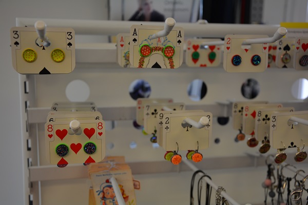 Myymälästä löytyy myös esimerkiksi muovipusseista tehdystä kuteesta virkattuja iPad-laukkuja sekä kahvipaketeista valmistettuja kasseja. Vanhoja pelikortteja taas on hyödynnetty kekseliäästi pahvina, johon myynnissä olevat korvakorut on kiinnitetty.