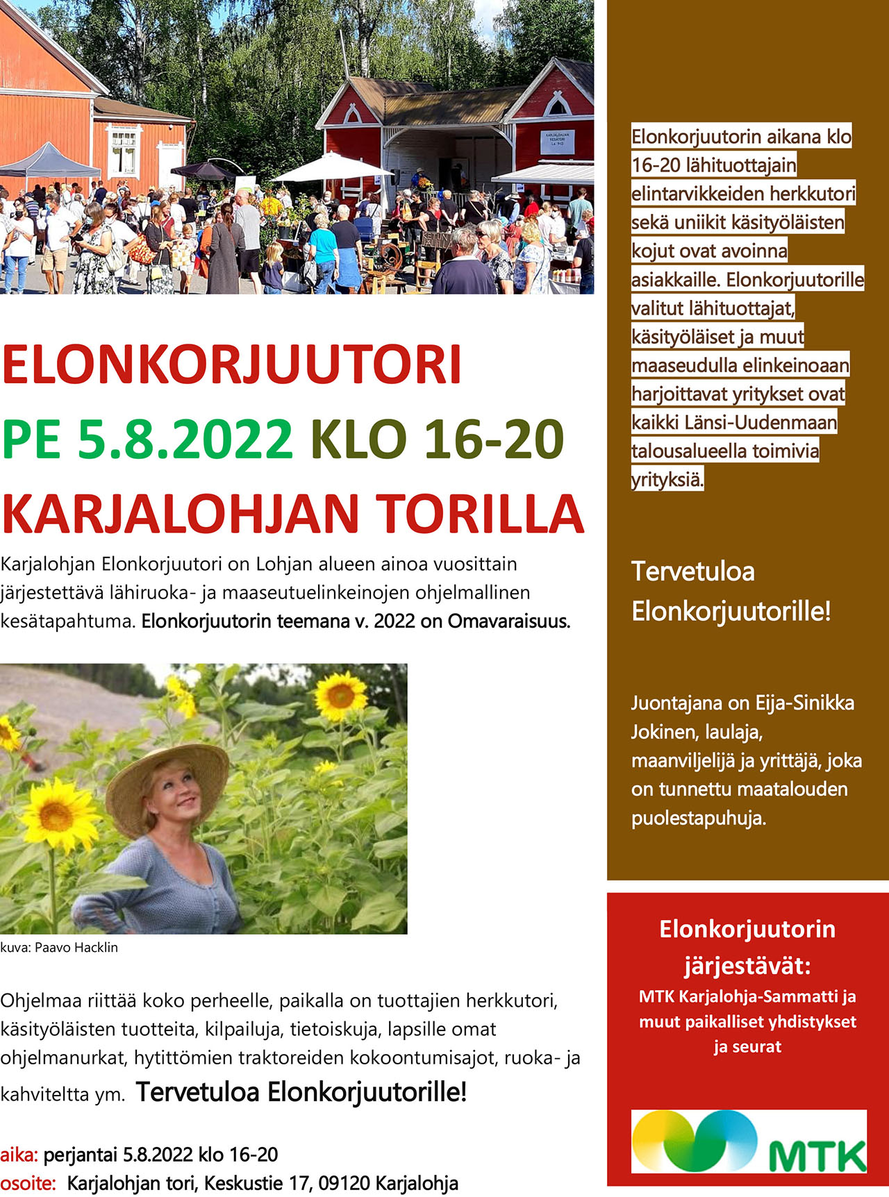 Karjalohjan Elonkorjuutori järjestetään jälleen perjantaina 5.8.2022 klo 16-20. Elonkorjuutori on Lohjan alueen ainoa vuosittain järjestettävä lähiruoka- ja maaseutuelinkeinojen ohjelmallinen kesätapahtuma. Elonkorjuutorin teemana vuonna 2022 on Omavaraisuus. Tapahtumassa on Lohjan maanpuolustusnaisten, VPK:n, MTK:n, LUVN Hyvinvointialueen ja maatalousyrittajien puheenvuoroja omavaraisuuteen sekä kotitalouksien varautumiseen liittyen. Vuosittain tapahtuma-alueelle saapuu n.700-800 tapahtumavierasta/asiakasta.