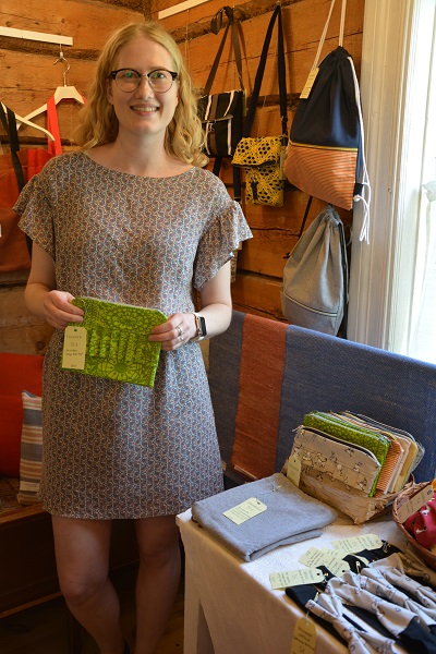 Iina Huikari on vastavalmistunut vaatetusompelija. Häneltä Käsitöiden myyntinäyttelyssä on paitoja, laukkuja ja asusteita.