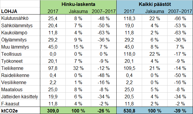 Kaikki päästöt kattavan laskennan ohella tulokset on tuotettu myös niin sanottujen Hinku-laskentasääntöjen mukaisesti. Hinku-laskelmasta on pyritty poistamaan tekijät, joihin kunnat eivät juurikaan pysty vaikuttamaan. Hinku-laskenta ei näin ollen sisällä päästökaupan piiriin kuuluvan teollisuuden päästöjä muuten kuin rakennusten lämmityksen osalta. Myös teollisuuden koko sähkönkulutus ja jätteiden käsittely jäävät Hinku-laskennan ulkopuolelle. Laskentatapa sisältää kuitenkin kaukolämpölaitoksen. Tällä laskentatavalla tuetaan kuntien ilmastotoimien kohdentamista ja arviointia.