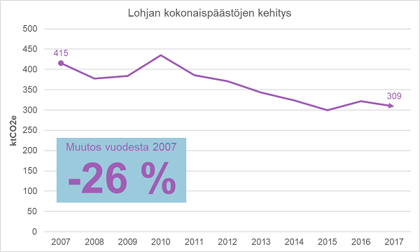 Laskelmat kuntien vuoden 2017 kasvihuonekaasupäästöistä on julkaistu. Lohjalla päästöt vähentyivät 4% vuodesta 2016. Vuodesta 2007 päästöt olivat vähentyneet 26 %.