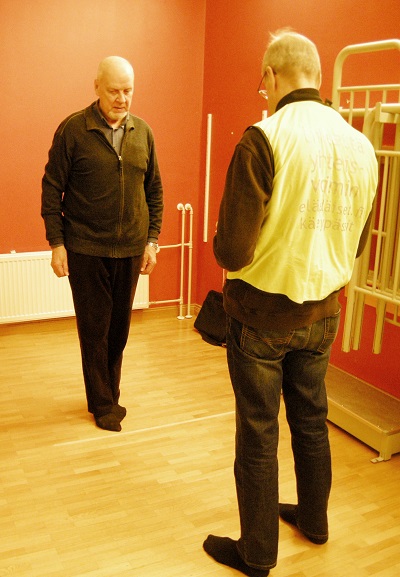 Yhdistyksen puheenjohtaja Esko Haanpää tasapainotestissä. Suoritusta valvoo Aarno Jalonen Kävelypässit-ryhmästä.