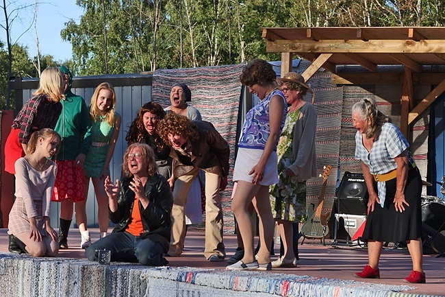 Kesäteatterissa pitää tietysti olla näyttäviä joukkokohtauksia, ja niitä tarjoavat niin kirkuvat tyttöfanit kuin paheksuvat kukkahattutäditkin. Pahennusta herättää tietysti myös somerolaisbändi ”The Five Yesin” keikka-auto: ruumisauto, johon mahtuu kolme henkeä ja yksi ruumis. Tämä osuus on muuten totta.