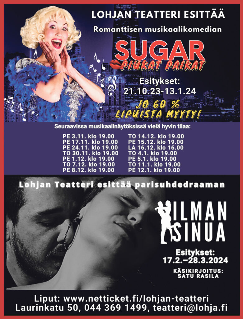 Sugar – Piukat paikat -musikaali Lohjan Teatterissa 21.10.-16.12.2023 ja 4.1.-13.1.2024.
