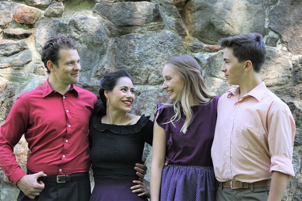 Pääroolien esittäjät Rasmus Basilier (Bernardo, vas), Anna-Kajsa Edström (Anita), Vilma Eklöv (Maria) ja Birk Lerviks (Tony). (Kuva: Mona Salama)