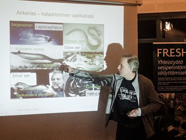 Hiidenvesi-illassa Luonnonvarakeskuksen tutkija Jouni Tulosen aiheena oli ankerias.