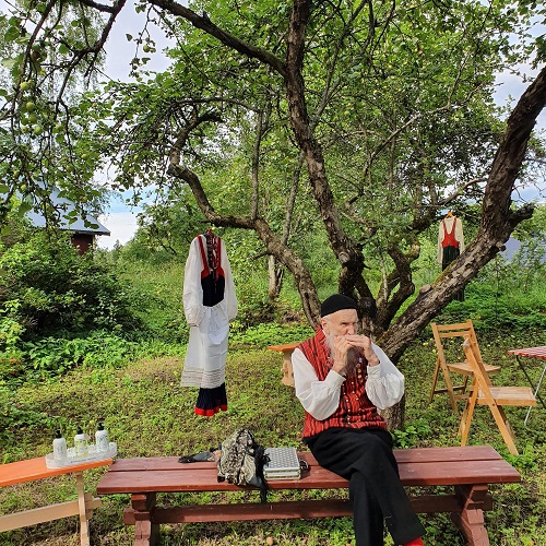 Kansallispukujen tuuletuspäivä ja Salmen päivän kahvit -kesätapahtuma Pusula-seuran Ahjonsuun kauppamuseolla viime kesänä. Kuvassa kyläpelimanni Ulenius.
