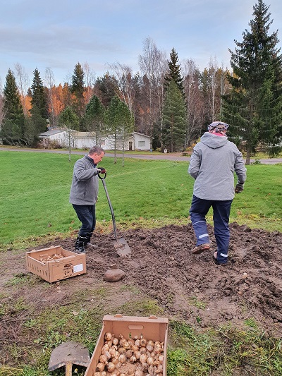 Aluetoimikunnan väki istutti viime syksynä kukkasipuleita Pusulan keskuskentän reunoille. Kuvassa Pekka Ruoholahti ja Kati Juolahti.