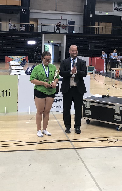 Johanna Selenius ja IKMF:n Suomen maavastaava, kisojen pääjärjestäjä urheilijoiden puolelta ja kisoissa päätuomarina toiminut Kim Jossfolk.