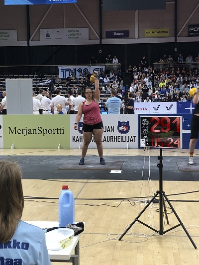 Omasta ennätyksestä jäätiin siis tässä lajissa aika paljon, mutta tulos 785 pistettä (314 toistoa 20 kg:n kuulalla) oikeutti kuitenkin päivän toiseen hopeamitaliin. Tahdonvoiman Timpanin Mona Kauppinen vei voiton ylivoimaisesti pisteillä 870,75 (387 toistoa, 18 kg:n kuulalla). Hyvinkään Ryhdin Satu Kurki oli kolmas ja Sumiaisten kunnon Miia Yliskoski neljäs.