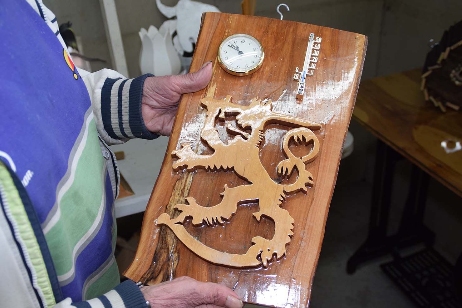 Kalle kertoo, ettei hänellä ole mikään pakko tehdä erilaisia lintupönttöjä, kelloja, lämpömittareita ja kaikkea muuta pientä ja isompaa puusta, mutta se pitää hänet aktiivisena ja nimenomaan mielen virkeänä.