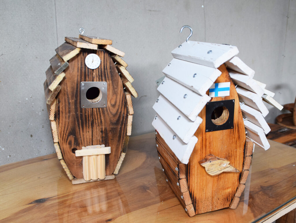 – Aurinkoisena päivänä teen mielelläni lisää tuotteista, ja sateisena ja kylmänä päivänä teen sitten jotain muuta. Eläkkeellä ollessani on aikaa toteuttaa villejäkin ideoita, aina tuotteiksi asti. On minulta ostettu linnunpönttöjä aina sisustustuotteiksi saakka, sen verran erikoisia ne ovat, kertoo Kalle.