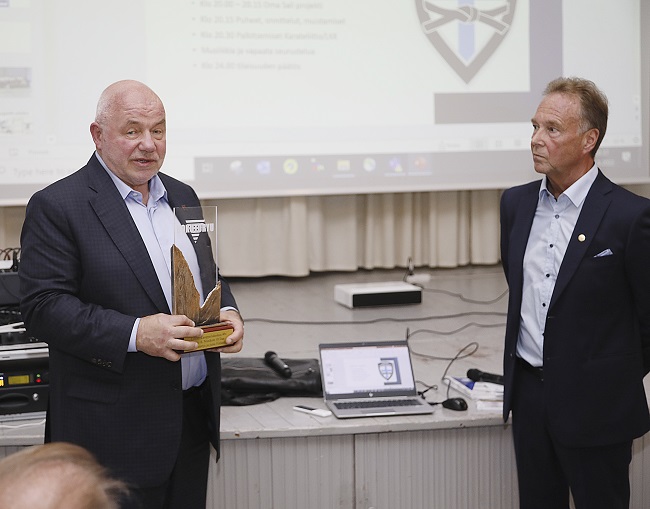 Auvo Niiniketo luovutti seuralle Hokutoryun palkinnon, johon voi tulevien vuosien varrella kaivertaa puheenjohtajien nimet. (Kuva: Matti Pirhonen)