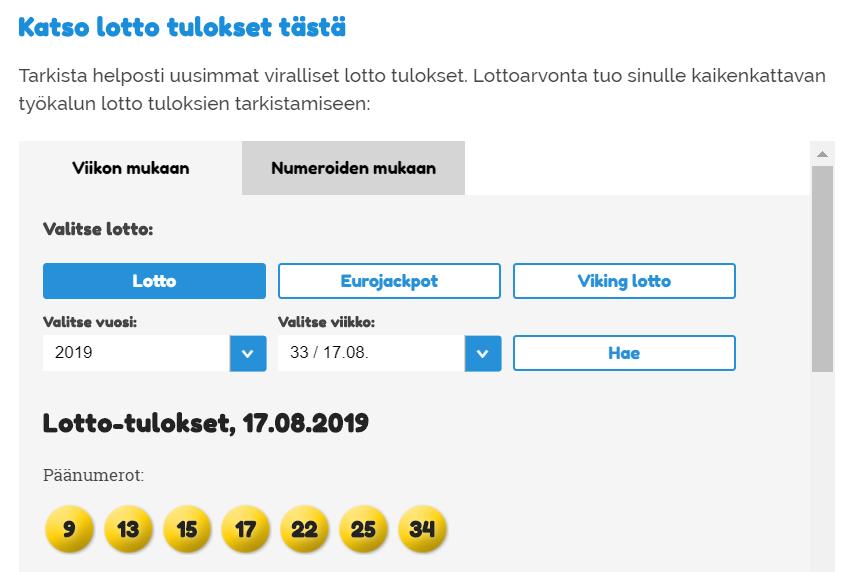 Mikäli haluat lisää jännitystä elämään voit myös syöttää numerosi tulostyökaluun ja nähdä helposti mikäli voitto osui kierroksella! Valitse vain “Numeroiden mukaan” ja syötä rivisi yksi kerrallaan. Tämän jälkeen klikkaa “Näytä voitinko”.