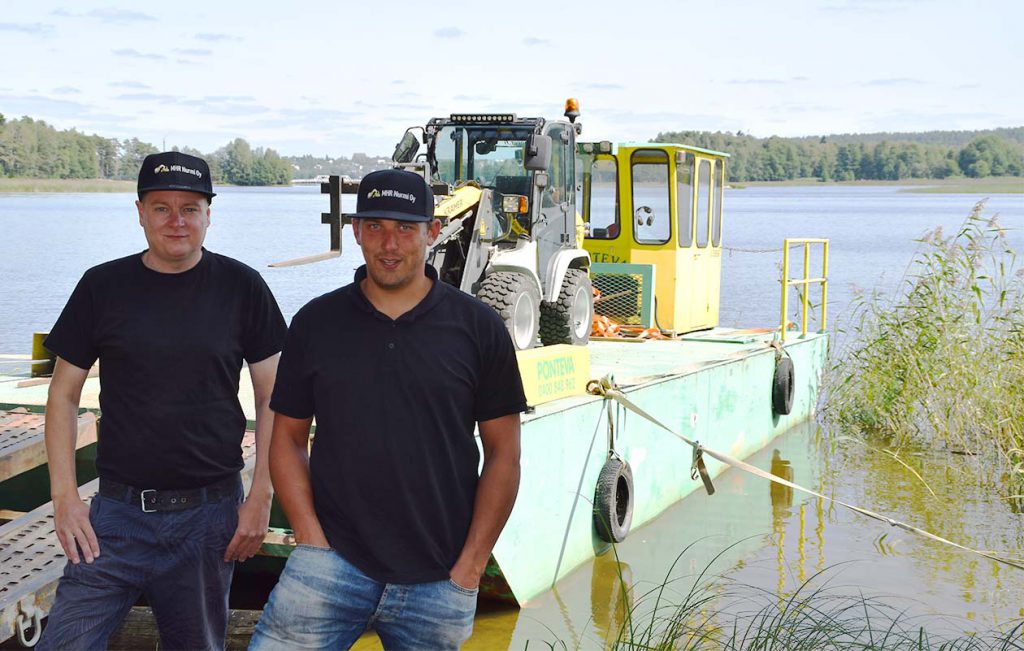 Meidän kuljetuslauttamme Ponteva voi kuljettaa mukanaan noin 15 tonnin rahdin ja sen mukana on tänäkin kesänä kulkenut niin mökkipakettia, työkoneita kuin roskalavoja saariin ja takaisin, kertovat Pekka Mustonen ja Mika Nurmi MHR Nurmi Oy.stä, joka on tänä kesänä tehnyt investointeja nimenomaan Lohjanjärven asukkaita ajatellen.