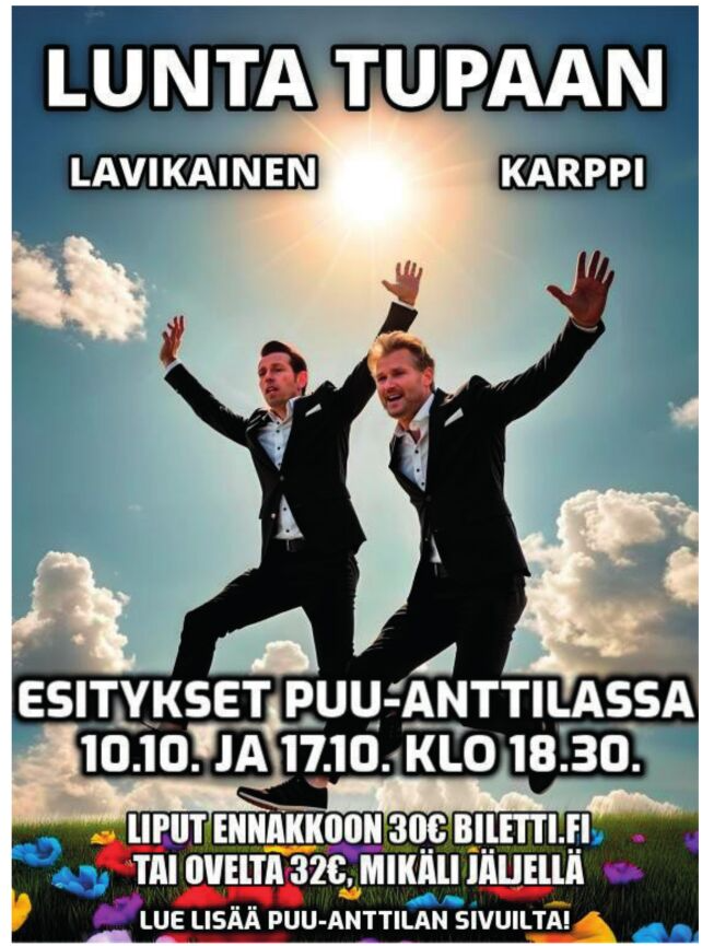 Pasi Karppi ja Timo Lavikainen. Kaksi tuttua nimeä, kaksi miestä, jotka ovat valmiita sukeltamaan taas kerran miesten mielenmaisemaan. Uusin näytelmä, “Lunta tupaan”, on itsenäinen teos, mutta samalla se on kuin peilikuva edelliselle menestykselle, “Mies miehelle” -esitykselle. Samat herrat, Pasi Karppi ja Timo Lavikainen, jatkavat elämän ihmettelyä, mutta tällä kertaa he tekevät sen hieman eri kulmasta, brittikomedian kulta-aikojen hengessä.
