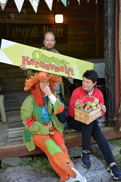 Lohjan Omenakarnevaalit ry:n puheenjohtaja Päivi Kallo, museoamanuenssi Matti Mäki Lohjan Museosta ja variksenpelätin Valle Valpas (Rosa Viitaniemi) odottavat jo malttamattomina ensi lauantain Omenakarnevaaleja.