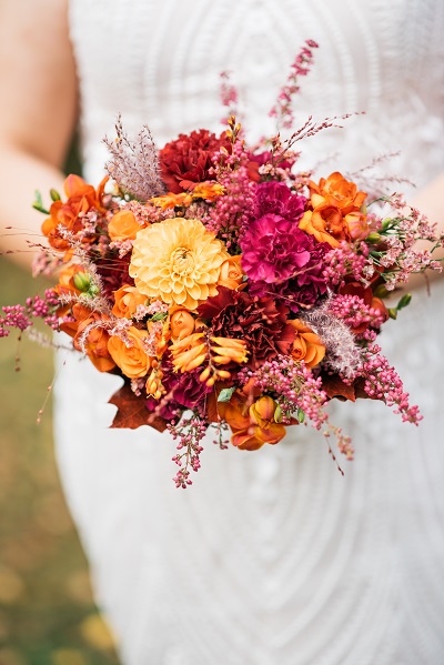 Varsinaista teemaa häissä ei ollut, mutta värimaailmasta löytyi syksyyn sopivia keltaisen ja oranssin sävyjä, jotka näkyivät niin kattauksessa kuin hääkimpussakin. Yllättäen sulhasen puku tuotti enemmän päänvaivaa kuin morsiamen.