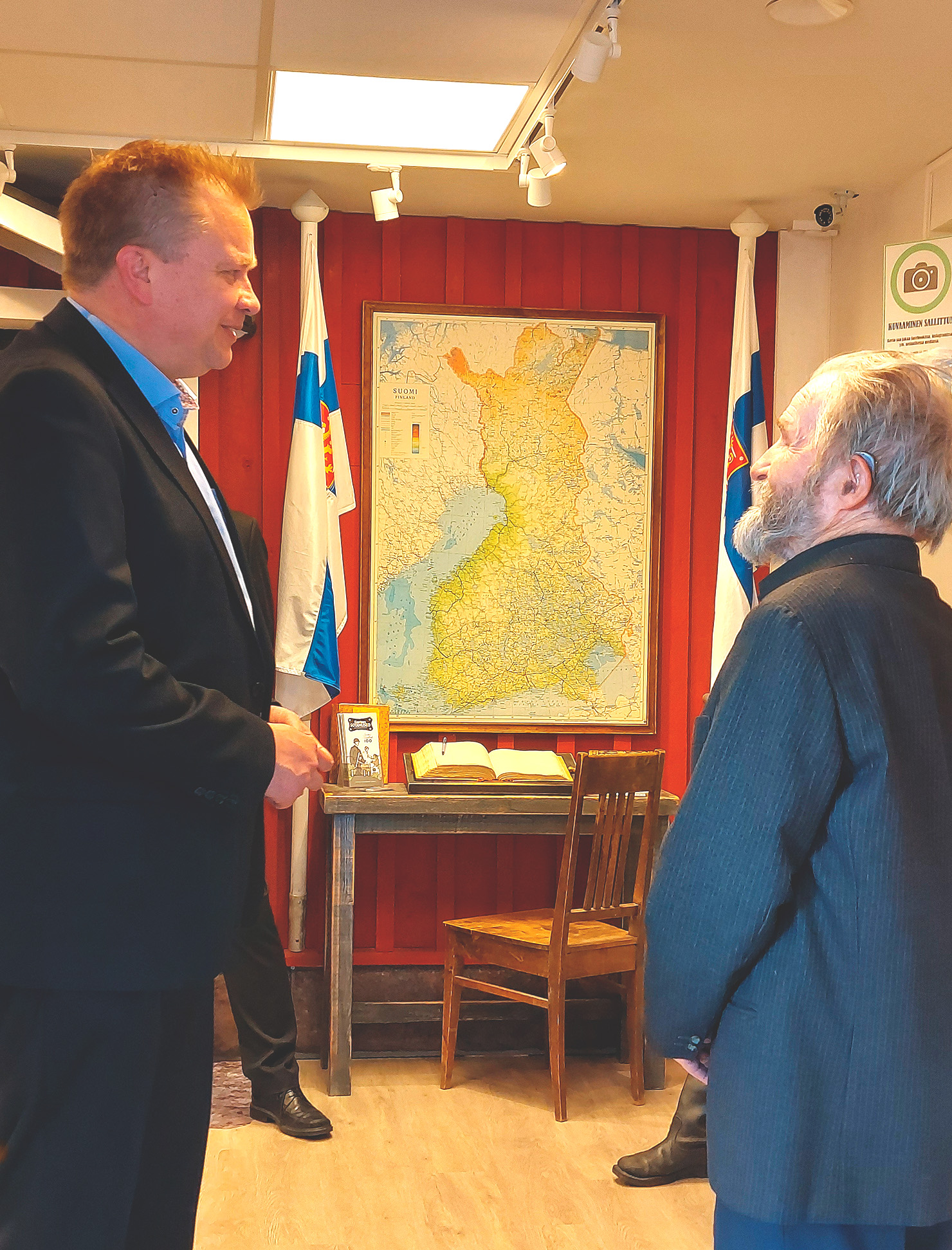 Melkoisen kova homma teillä on varmasti tässä ollut, en voi kuin arvostaa tällaista yksityisen tahon Suomen historiaan ja itsenäisyyteen liittyvää työtä, sanaili ministeri Kaikkonen. Kun sitten seuraavaksi avattiin ovi eteenpäin, hän ehti sanoa, jahas täällä on vielä lisääkin.