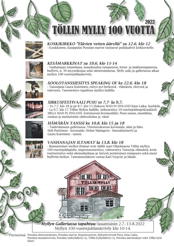 Tänä kesänä 2022 Pusulan maaseudulla tapahtuu monipuolisesti ja paljon kulttuurin saralla, kun koko paikkakunta juhlii 100-vuotiasta Töllin myllyä. 12.6. alkanut kulttuurikesä saa jatkoa koko kesäsesongin ajan erilaisin esittävän taiteen tapahtumien sekä perinteisten markkinoiden muodossa, ja huipentuu elokuussa 13.8. järjestettäviin iltamiin Töllin myllyn hallissa ja alueella. Kaikki tapahtumat ovat avoimia niin paikallisille kuin muualta tuleville, järjestäjät toivovatkin, että Töllin mylly, sen historia ja koski sekä tapahtumat itsessään houkuttelevat paikan päälle niin ensikertalaisia kuin paikan jo tuntevia kävijöitä.