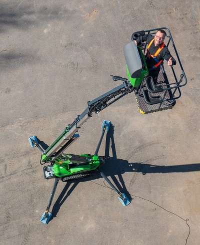 Toimitusjohtaja Juha Ojalaesittelee Ojamartin valikoimasta löytyviä henkilönostimia. Tela-alustaisella henkilönostimella pääsee hyvin niin mäkiseen maastoon kuin ahtaisiinkin paikkoihin. (Kuva: Antti Hannuniemi)