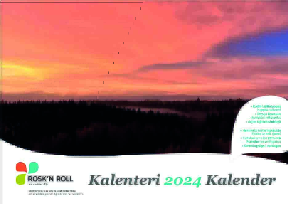 Rosk’n Rollin julkaisema jätehuollon seinäkalenteri on täynnä hyödyllistä tietoa jätteiden kierrättämisestä ja jätehuoltopalveluista. Vuoden 2024 kalenteri jaetaan postitse tällä viikolla (vko 48).