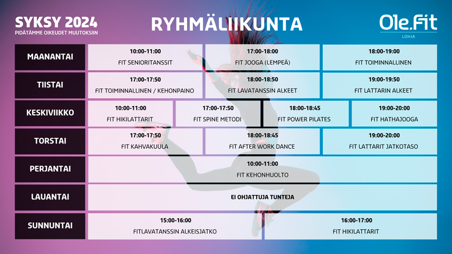 Jokainen tunti on suunniteltu niin, että se tarjoaa haastetta ja iloa yhtä aikaa, ja samalla voit nauttia yhdessä liikkumisen voimasta. Ammattitaitoiset ohjaajamme ovat tukenasi auttaen sinua pääsemään tavoitteisiisi ja tekemään jokaisesta harjoituskerrasta uniikin kokemuksen. Tervetuloa mukaan kokemaan, miten ryhmäliikunta voi antaa päivääsi uutta energiaa ja innostusta!