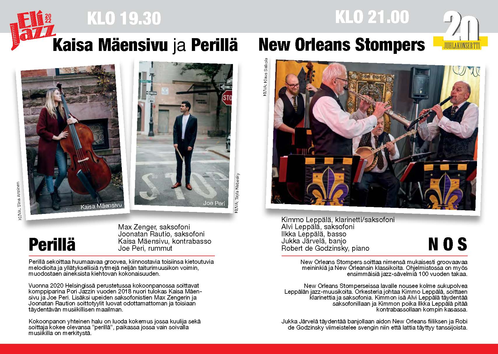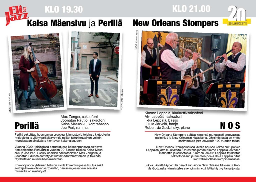 Lavalle nousee kaksi kokoonpanoa: illan aloittaa Kaisa Mäensivu ja Perillä, toisena on New Orleans Stompers, lohjalaisen Leppälän perheen kolmen sukupolven soittajien kokoonpano.