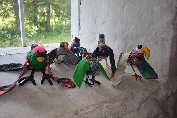 Yksi Pikarlan teoksista koostuu parvesta erinäköisiä, kankaisia lintuja.