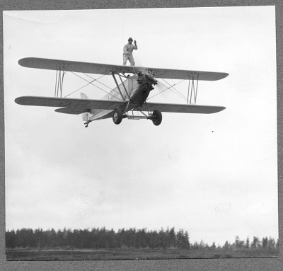 –Idea syntyi Yhdysvalloissa ensimmäisen maailmansodan jälkeen, kun Ormer Locklear päätyi ilmavoimien koulutuskeskuksessa temppuilemaan lentokoneen siiville. Hän ehdotti esimiehilleen, että konekiväärit voisi sijoittaa koneen rungon sijaan siipiin. Esimiehet olivat kuitenkin sitä mieltä, että kone kampeaisi. Locklear meni sitten itse seisomaan siiville osoittaakseen, että idea toimii. Tämä herätti huomiota ilmavoimissa ja Locklear lähti parin muun kaverin kanssa kiertämään Yhdysvaltoja. He roikkuivat lentokoneista ja hyppivät koneesta toiseen, Mustonen kertoo.