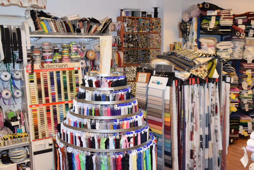 – Meillä on valikoimassa niin lankaa, nappeja, siirtokuvia, vetoketjut, kuminauhoja yms, mitä vaatteiden ja sisustuskankaiden valmistamiseen saatetaan tarvita.