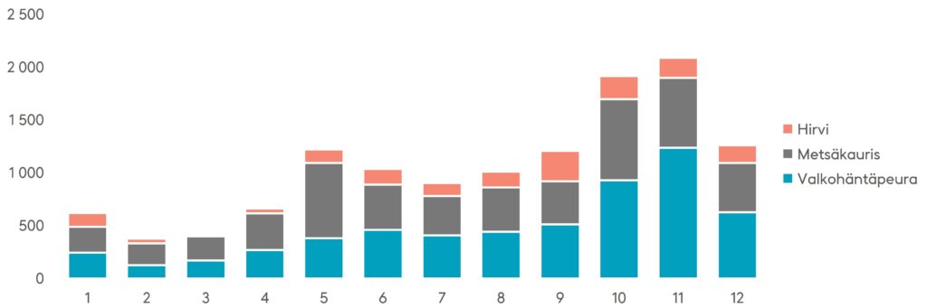 Metsäkauriiden ja valkohäntäpeurojen osuus onnettomuuksista on ylivoimaisesti suurin. Erityisesti metsäkauriiden kanssa sattuneiden kolareiden määrä on ollut viime vuosina selvässä kasvussa loppuvuoden aikana. Suurin osa, noin puolet kaikista hirvieläinonnettomuuksista, sattuu juuri valkohäntäpeurojen kanssa.