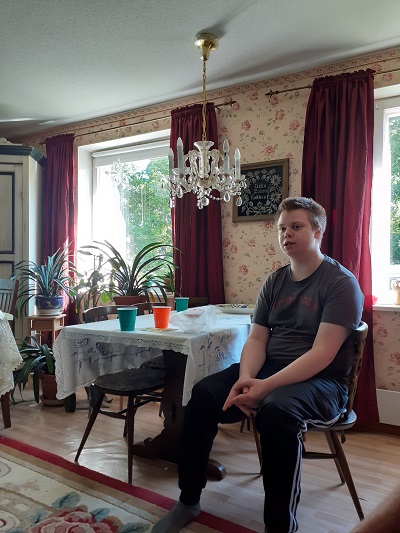 Kävimme Tuuman pajanuorten Matiaksen ja Jaakon, työpajan esimiehen Matin sekä erityisnuorisotyöntekijän Tiinan kanssa vierailulla Ojalan perhehoitokodissa torstaina 29. elokuuta. Tämä Karjalohjalla sijaitseva perhehoitokoti ja sen kuusi kehitysvammaista aikuisasukasta olivat Tiinalle entuudestaan tuttuja. Saapuessamme hoitokodin pihaan avautui silmiemme eteen kaunis maalaismaisema. Hoitokoti näytti ulkoapäin hyvin sievältä ja viihtyisältä pikku puutalolta, ja se toi itselleni mieleen mummolan mökin. Talo vaikutti viihtyisältä myös sisältäpäin vanhanaikaisine tapetteineen ja vanhoine viehättävine esineineen. Iloa silmälle toivat lisäksi seinillä olevat asukkaiden itsensä tai heidän läheistensä tekemät taideteokset.