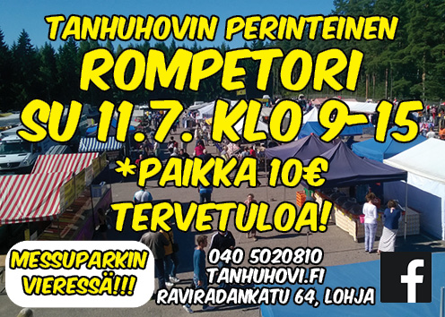 Nämä heinäkuun tapahtumat ovat siis joka viikko, sekä rompetori että asuntomessutanssit, sillä aivan Tanhuhovin vieressä on asuntomessujen virallinen parkkialue, ja Tanhuhovi haluaa omalta osaltaan toivottaa kaikki messuvieraat tervetulleiksi Lohjalle, vaikka iltaa viettämään.