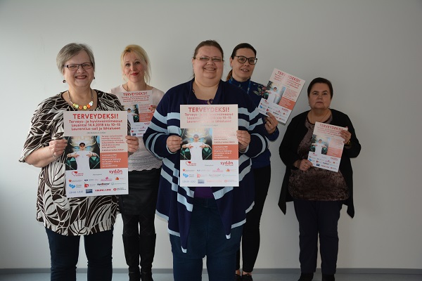 Terveys- ja hyvinvointimessut järjestetään monen toimijan yhteisvoimin. Mukana ovat mm. Lohjan kaupunki, Laurea ja runsas joukko yhdistyksiä. Tapahtumajärjestelyissä mukana ovat mm. Eija Perkiömäki (vas), Kirsi Siira (Laurea), tapahtumapäällikkö Heli Perkiömäki, Anu Elorinne (Laurea) ja Päivi Yletyinen (Lohjan kaupunki).
