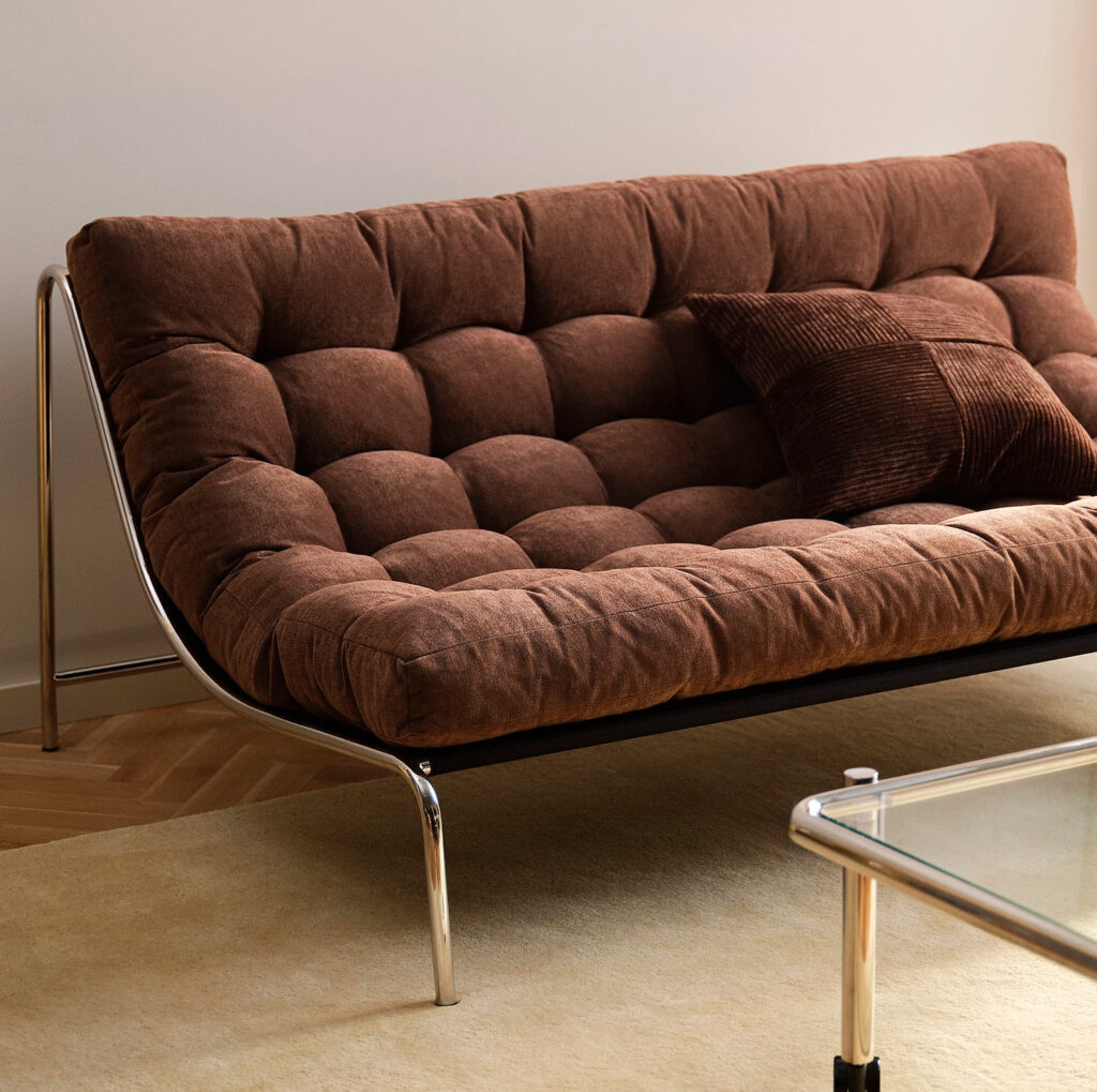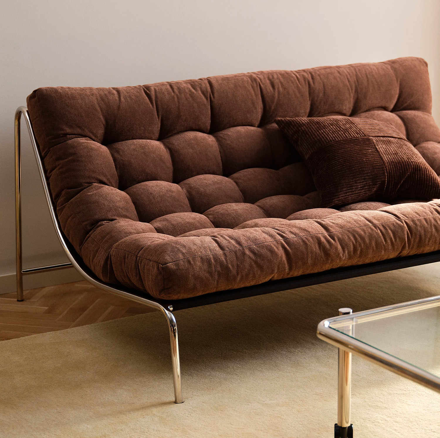BURLESON-sohvan muotoilu nojaa vahvasti selkeisiin linjoihin ja harkittuihin yksityiskohtiin. Sen tuftattu pinta tuo mieleen klassiset Chesterfield-sohvat, mutta toteutus on tuotu tähän päivään kevyemmän rakenteen avulla. Sohva ei dominoi huonetta raskaalla olemuksellaan, vaan se tuntuu ilmavalta siron metallirunkonsa ansiosta. Metalliset yksityiskohdat ovatkin yksi vuoden 2025 suurimmista sisustustrendeistä, sillä ne tuovat tilaan kaivattua särmää ja modernia kontrastia.
