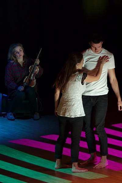 Suojatiellä kohtaavat Anna Rimpinen ja Juha Koivuporras. Tunnelmaa tarinaan luo viulisti Pinja Mäentaka. (Kuva: Juha Saarinen)