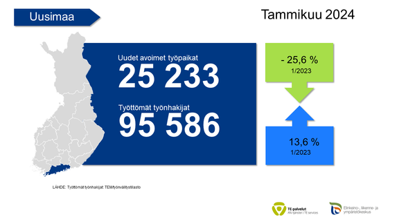 Uusia avoimia työpaikkoja ilmoitettiin Uudenmaan TE-toimistoon tammikuussa 25 233, mikä on 25,6 % vähemmän kuin vuosi sitten. Koko maan tasolla vuosimuutos oli -20,5 %.